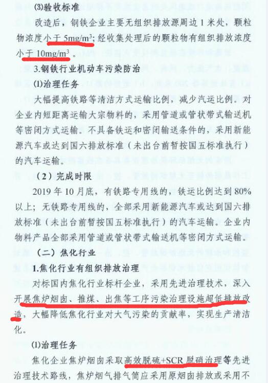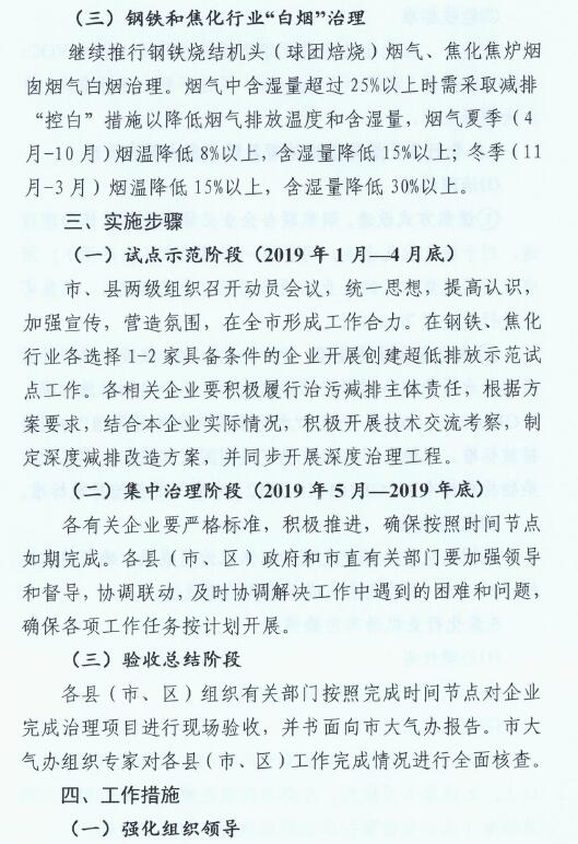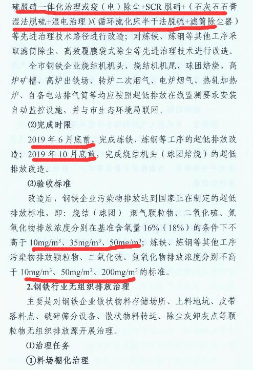 1、2019年6月底前,完成煉鐵、煉鋼等工序的超低排放改造;2019年10月底前,完成燒結(jié)機頭(球團焙燒)的超低排放改造。