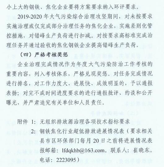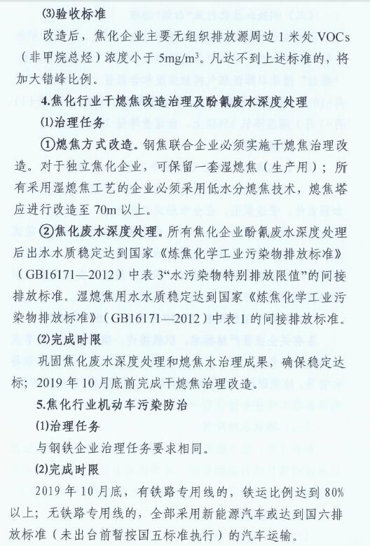 1、2019年6月底前,完成推焦、出焦其他工序的超低排放改造;2019年10月底前,完成焦爐煙囪的超低排放改造。