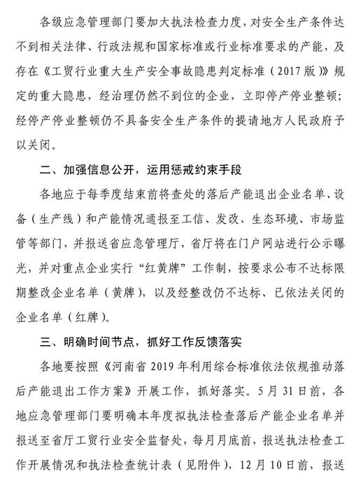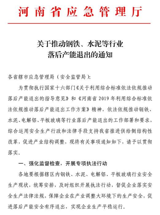 4月25日,河南省應(yīng)急管理廳下發(fā)《關(guān)于推動(dòng)鋼鐵、水泥等行業(yè)落后產(chǎn)能退出的通知》?!锻ㄖ访鞔_表示將利用安全生產(chǎn)行政和法律手段推進(jìn)水泥、鋼鐵等行業(yè)落后產(chǎn)能退出?!锻ㄖ芬蟾骷?jí)應(yīng)急管理部門要加大執(zhí)法檢查力度,對(duì)安全生產(chǎn)條件達(dá)不到相關(guān)法律、行政法規(guī)和國家標(biāo)準(zhǔn)或行業(yè)標(biāo)準(zhǔn)要求的產(chǎn)能,及存在《工貿(mào)行業(yè)重大生產(chǎn)安全事故隱患判定標(biāo)準(zhǔn)(2017版)》規(guī)定的重大隱患,經(jīng)治理仍然不到位的企業(yè),立即停業(yè)停產(chǎn)整頓;經(jīng)停業(yè)停產(chǎn)整頓仍不具備安全生產(chǎn)條件的提請(qǐng)地方人民政府予以關(guān)閉。