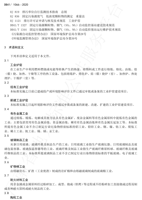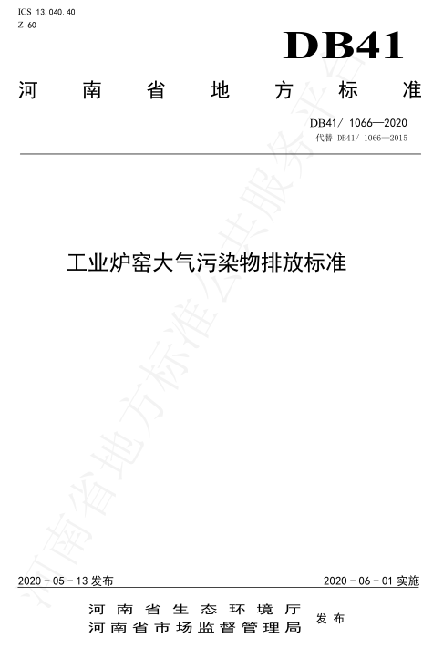 2020年4月10日,河南省市場(chǎng)監(jiān)督管理局、河南省生態(tài)環(huán)境廳在鄭州主持召開(kāi)了地方標(biāo)準(zhǔn)審查會(huì),對(duì)河南2015年發(fā)布的(DB41/1066-2015)進(jìn)行了修訂。2020年5月19日,河南省市場(chǎng)監(jiān)督管理局以2020年29號(hào)公告批準(zhǔn)發(fā)布了新修訂的《工業(yè)爐窯大氣污染物排放標(biāo)準(zhǔn)》(DB41/1066-2020),2020年6月1日起實(shí)施。
