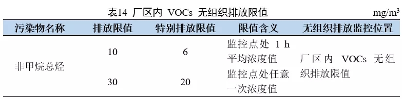 本標(biāo)準(zhǔn)規(guī)定了 VOCs物料儲(chǔ)存無(wú)組織排放控制要求、VOCs物料轉(zhuǎn)移和輸送無(wú)組織排放控制要求、工藝過(guò)程 VOCs無(wú)組織排放控制要求、設(shè)備與管線組件 VOCs 泄漏控制要求、敞開液面 VOCs無(wú)組織排放控制要求,以及VOCs無(wú)組織排放廢氣收集處理系統(tǒng)要求、企業(yè)廠區(qū)內(nèi)及周邊污染監(jiān)控要求。標(biāo)準(zhǔn)適用于涉及 VOCs無(wú)組織排放的現(xiàn)有企業(yè)或生產(chǎn)設(shè)施的 VOCs無(wú)組織排放管理,以及涉及VOCs無(wú)組織排放的建設(shè)項(xiàng)目的環(huán)境影響評(píng)價(jià)、環(huán)境保護(hù)設(shè)施設(shè)計(jì)、竣工環(huán)境保護(hù)驗(yàn)收、排污許可證核發(fā)及其投產(chǎn)后的 VOCs無(wú)組織排放管理。標(biāo)準(zhǔn)主要對(duì)無(wú)組織管控提出要求,在限值方面,強(qiáng)調(diào)了廠區(qū)內(nèi) VOCs 無(wú)組織排放的限值要求,見(jiàn)下表。該標(biāo)準(zhǔn)已于 2020 年 7 月 1 日起全面實(shí)施。