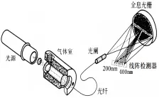 光源發(fā)出的紫外光通過光纖傳輸?shù)綔y量室,測量室樣氣在特定波段吸收紫外光譜能量,被吸收后的光束通過光纖傳輸?shù)焦庾V儀,在光譜儀內部經(jīng)過光柵分光,由二極管陣列檢測器將分光后的光信號轉換為電信號,獲得氣體的連續(xù)吸收光譜信息,最后根據(jù)特定算法計算待測氣體濃度。其結構示意圖如下: