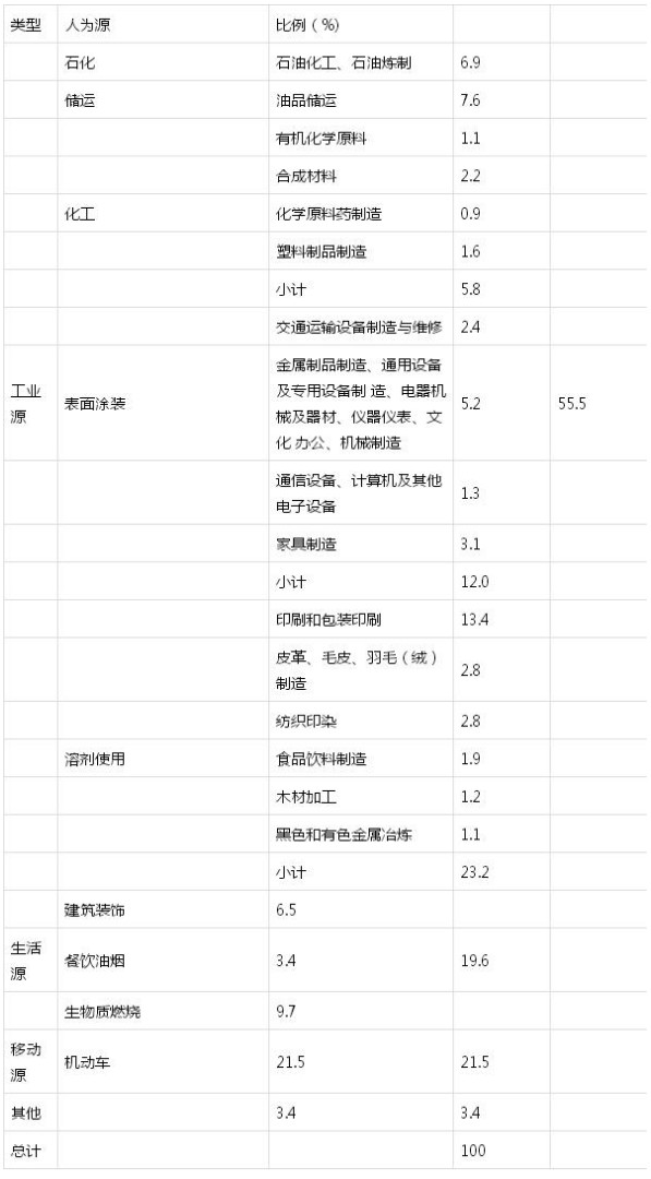 工業(yè)源VOCs排放涉及的行業(yè)眾多,目前缺乏權(quán)威認(rèn)可的排放清單。2009年起環(huán)保部污控司組織中科院生態(tài)中心、清華大學(xué)、同濟(jì)大學(xué)、解放軍防化研究院、地質(zhì)大學(xué)、華南理工大學(xué)等高等院校和科研院所中VOCs防治領(lǐng)域的專家對(duì)人為源排放情況進(jìn)行估算。表1列出了估算的結(jié)果,其中工業(yè)源排放量占整個(gè)人為源的比重最高達(dá)55.5%,工業(yè)源中的重點(diǎn)工業(yè)行業(yè)包括石油煉制和儲(chǔ)運(yùn)、化工、溶劑使用(包括表而涂裝)等。在工業(yè)源的四個(gè)產(chǎn)污環(huán)節(jié)中,含VOCs產(chǎn)品的使用過程環(huán)節(jié)排放最多,占整個(gè)工業(yè)源排放的60%以上,應(yīng)予以重點(diǎn)控制。