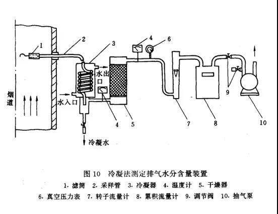 方法原理:由煙道中抽取一定體積的排氣,使之通過冷凝器,根據(jù)冷凝出來的水量,加上從冷凝器排出的飽和氣體含有的水蒸汽量,計算排氣中的含濕量。