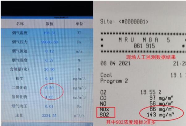 企業(yè)煙氣在線監(jiān)測系統(tǒng)的日常運維交給第三方山西世紀天源環(huán)保技術(shù)有限公司負責。督察發(fā)現(xiàn),運維公司通過在線監(jiān)測數(shù)據(jù)造假等方式,掩蓋恒達公司偷排和嚴重超標排放的違法事實。煙道煙溫是判斷旁路煙氣是否偷排的重要指標,但運維公司人員在日常運維中一直上報煙溫監(jiān)測設(shè)備存在故障,認為數(shù)據(jù)失真,而對煙氣二氧化硫、氮氧化物濃度長期低于10毫克/立方米的異常情況熟視無睹,裝聾作啞。經(jīng)現(xiàn)場人工監(jiān)測,煙氣實際二氧化硫和氮氧化物排放濃度分別為143毫克/立方米和86毫克/立方米,其中二氧化硫濃度超過《煉焦化學工業(yè)污染物排放標準》3.8倍,與此同時在線監(jiān)測數(shù)據(jù)卻顯示二氧化硫、氮氧化物濃度分別為0.50毫克/立方米和4.05毫克/立方米,數(shù)據(jù)嚴重失真,存在造假行為。△圖7 在線監(jiān)測數(shù)據(jù)(左圖)顯示二氧化硫和氮氧化物濃度分別為0.50毫克/立方米和4.05毫克/立方米;而現(xiàn)場人工監(jiān)測數(shù)據(jù)(右圖)顯示二氧化硫和氮氧化物實際濃度分別為143毫克/立方米和86毫克/立方米。在線監(jiān)測數(shù)據(jù)嚴重失真,存在造假行為。