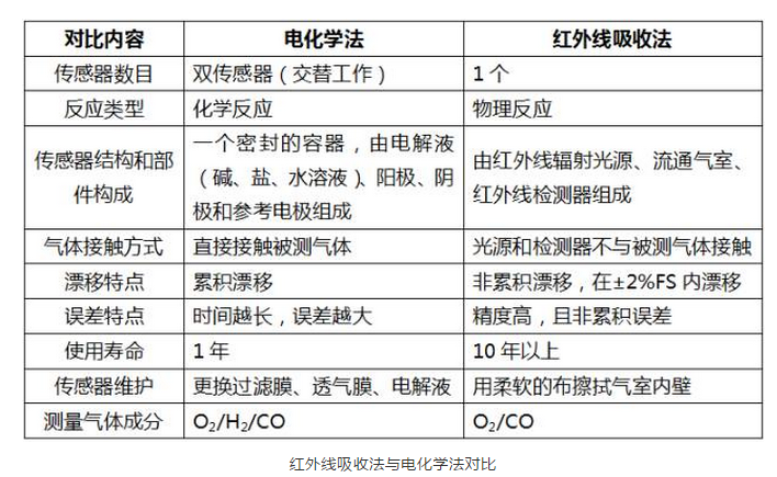 CO氣體檢測(cè)的主要方法有:紅外線吸收法、電化學(xué)法、電氣法(熱導(dǎo)式和半導(dǎo)式)、色譜法,目前CO氣體濃度在線檢測(cè)通常使用紅外線吸收法、電化學(xué)法。