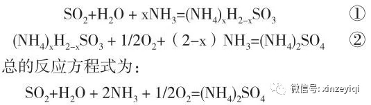 氨脫硫技術(shù)是基于NH3和SO2在水溶液中的反應。煙氣脫硫塔吸收段中的NH3吸收鍋爐煙氣中的SO2,得到亞硫酸銨或亞硫酸氫銨水溶液。如反應方程式①,在脫硫塔的氧化段,將壓縮空氣吹入氧化段,亞硫酸銨發(fā)生氧化反應生成硫酸銨溶液,參見方程式②。