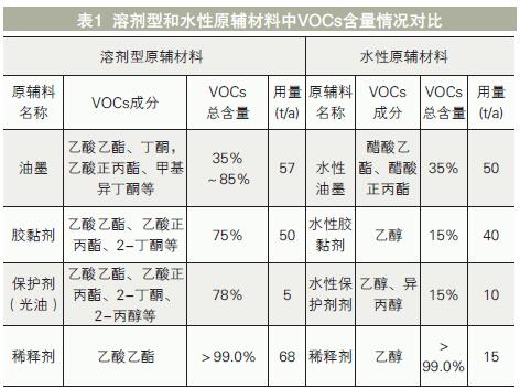 某薄膜印刷企業(yè)分別采用溶劑型和水性原輔材料生產(chǎn)同一產(chǎn)品的情況下,VOCs的成分及含量對(duì)比情況見表1。該企業(yè)改用水性材料后,VOCs產(chǎn)生量減少了約80%。可見采用水性原輔材料可大大減少VOCs排放種類和數(shù)量。
