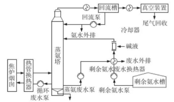 以焦爐煙道廢氣為熱源的負壓蒸氨工藝流程:剩余氨水經換熱器換熱后送入蒸氨塔進行蒸餾,蒸氨塔頂氨汽經分縮器、冷卻器冷卻后,冷卻氨水進入回流槽,槽頂不凝汽在真空裝置吸力作用下,經冷卻器冷卻后進入吸煤氣管道中;槽底氨水用回流泵抽出,一部分送蒸氨塔頂回流,一部分作為產品氨水外送。蒸氨塔底蒸氨廢水進入煙氣熱管換熱器循環(huán)加熱后返回蒸氨塔內;另一部分蒸氨廢水與原料剩余氨水換熱降溫后送廢水處理裝置。其工藝流程圖如圖5所示。