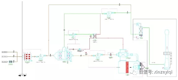 含有VOCs的廢氣通過風機進入沸石轉(zhuǎn)輪,沸石轉(zhuǎn)輪對VOCs進行吸附,凈化后的氣體直接排至大氣中。新鮮空氣經(jīng)過CO燃燒爐的換熱器及電熱器加熱后,進入轉(zhuǎn)輪托脫附區(qū),根據(jù)轉(zhuǎn)輪脫附入口溫度控制電加熱器的功率,保證脫附溫度≥150℃。在150℃的脫附氣體作用下,沸石中的VOCs被脫附出來,經(jīng)過阻火器、風機,經(jīng)換熱器加熱后進入反應器中。在CO反應器中廢氣被電加熱器加熱至300℃以上,經(jīng)過催化劑時VOCs被催化氧化成H2O和CO2,隨后經(jīng)兩級換熱器廢熱利用后達標排放。