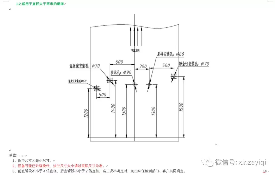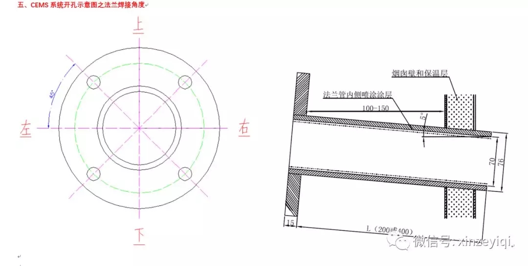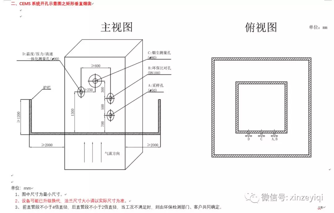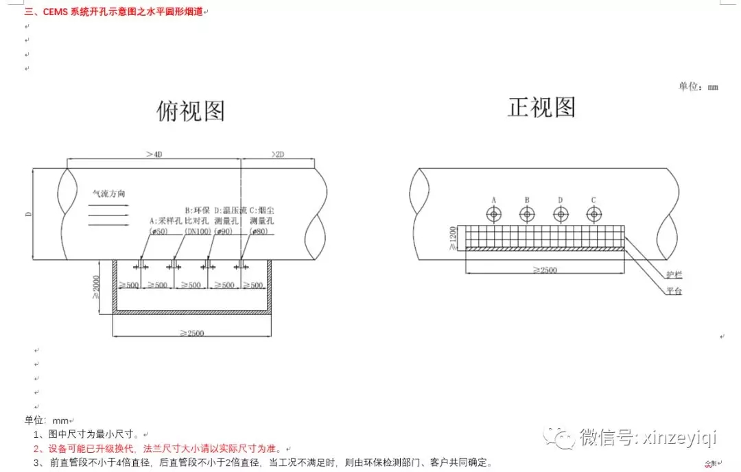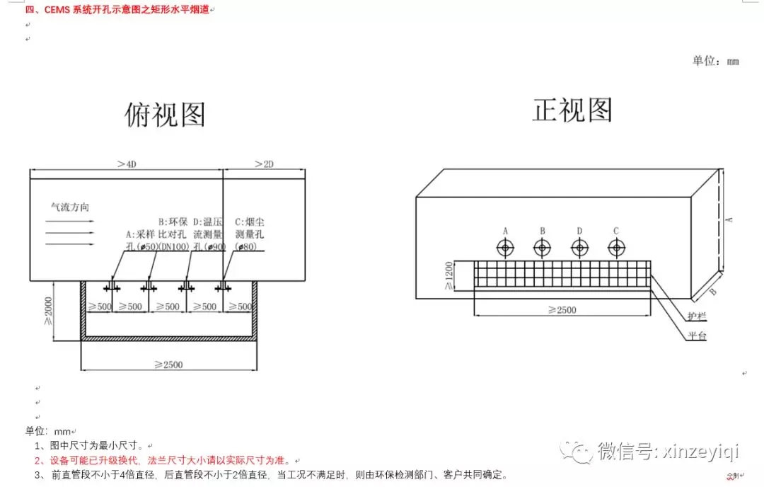 注意:開孔位置及法蘭之間的距離尺寸可以按照開孔示意圖來開孔施工,開孔的大小要根據(jù)煙氣在線監(jiān)測設(shè)備生產(chǎn)廠家的實際法蘭大小以及盲管直徑的粗細(xì)來施工。