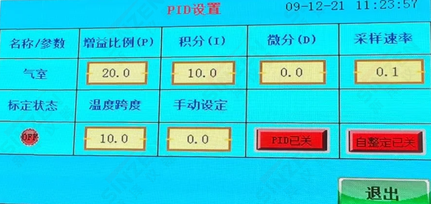 溫度PID自整定畫面應該是PID已關(guān)按鍵變成綠色按健,PID已開為正常狀態(tài)。當溫度到達180度設(shè)置值后,需要手動點擊一下自整定已關(guān)按鍵,變成綠色,自整定已開,經(jīng)過一分鐘后自動恢復紅色狀態(tài)。