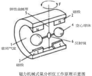 基本原理:其工作原理是基于氧的順磁性,一個小的逆磁性的啞鈴懸掛在非均勻磁場中,當被測氣體中有氧氣存在時,氧分子受磁場吸引導致啞鈴旋轉、補償力矩的張力要將啞鈴維持在原來的位置,張力的大小與樣氣中的氧分壓成正比。被測氣體氧含量不同,旋轉力矩和復位力矩的平衡位置就不同,也就是啞鈴的偏轉角度就不同,這樣,啞鈴偏轉角度的大小,就反映了被測氣體中氧含量的多少。對啞鈴球偏轉角度的測量,大多是采用光電系統(tǒng)來完成的。