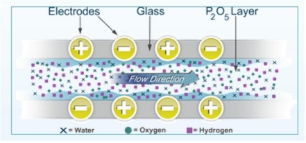 基本原理:傳感器采用五氧化二磷電解法原理,此傳感器由一個玻璃材質的圓柱和兩根并行的電極(通常由鉑或銠金屬絲制成)組成,并在兩根電極之間涂有很薄的一層磷酸膜層。在兩電極間施加一直流電壓,氣體中的水分被作為吸濕劑的五氧化二磷膜層連續(xù)吸收,生成磷酸,并被電解為氫和氧,同時五氧化二磷得以再生。通過連續(xù)的電解過程,在樣氣的水分含量與電解后的水分之間建立平衡,電解電流與樣氣中水分含量成比例。